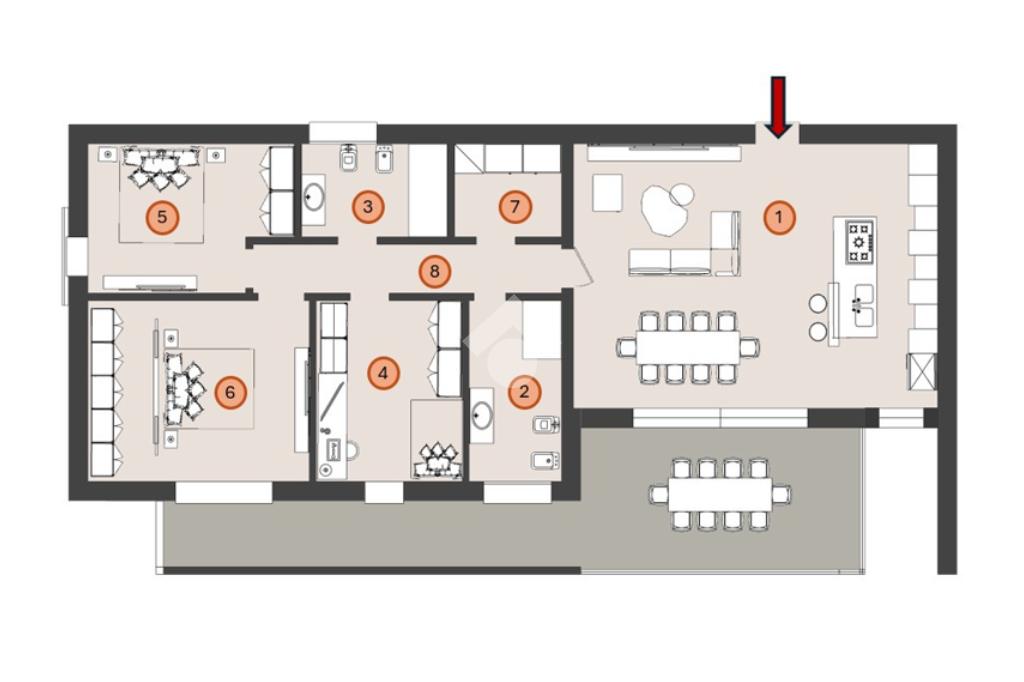 La soluzione proposta è un quadrilocale al piano primo, dotato di ascensore, caratterizzato da un’ampia zona living di 40 mq, tre camere da letto di cui la padronale di oltre 16 mq, due bagni ed un vano tecnico adibito a lavanderia.