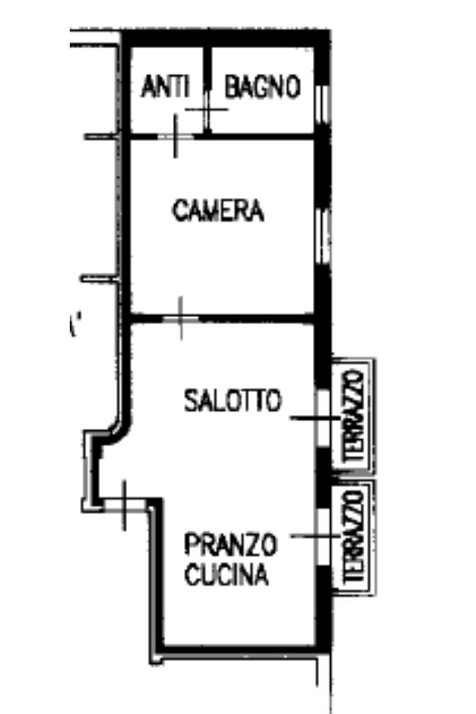 La soluzione è caratterizzata da una zona giorno con angolo cottura dotata di due poggioli e, a seguire, dalla zona notte composta da una camera da letto matrimoniale e da un bagno finestrato con box doccia dotato di antibagno/lavanderia.