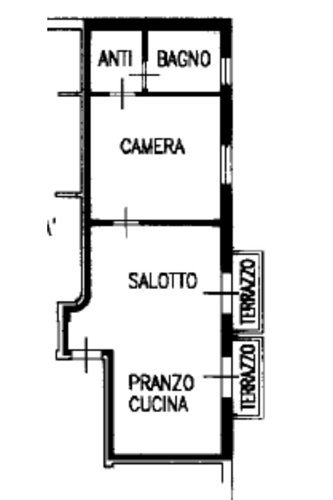 La soluzione è caratterizzata da una zona giorno con angolo cottura dotata di due poggioli e, a seguire, dalla zona notte composta da una camera da letto matrimoniale e da un bagno finestrato con box doccia dotato di antibagno/lavanderia.
