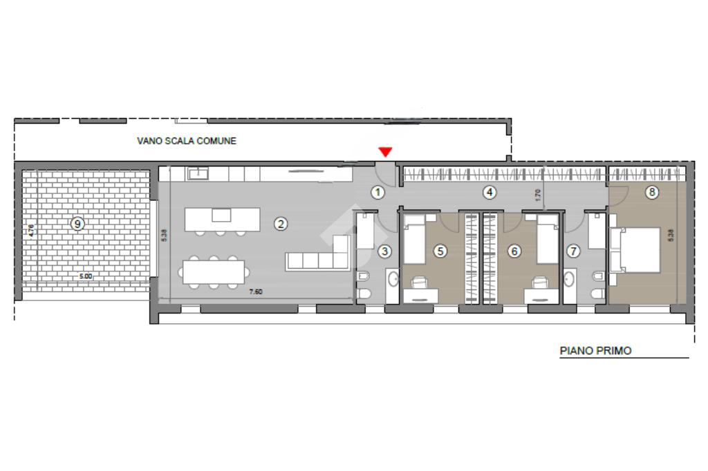 La soluzione proposta è un quadrilocale al piano primo ed ultimo, caratterizzato da un’ampia zona living di oltre 40 mq, un generoso disimpegno in cui adibire armadiature a muro, tre camere da letto e due bagni.