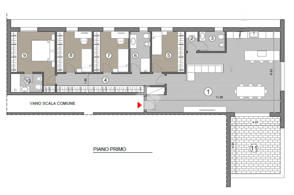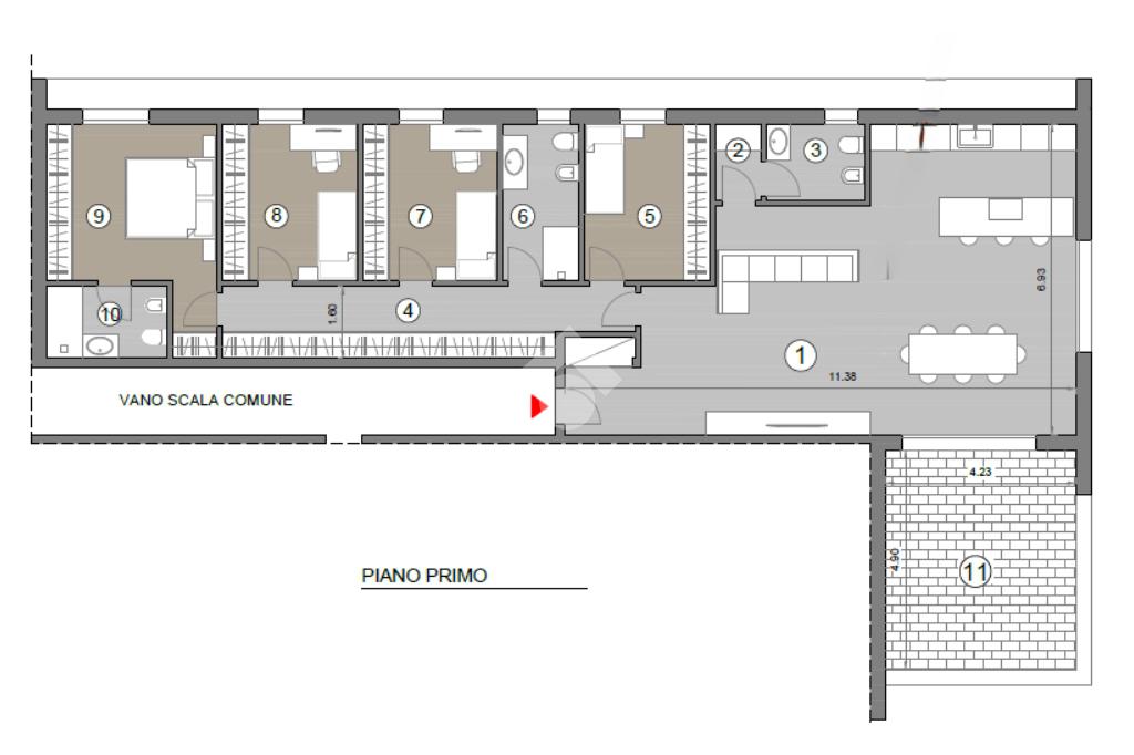 La soluzione proposta è un appartamento al piano primo ed ultimo, caratterizzato da un’ampia zona living di circa 60 mq, un generoso disimpegno in cui adibire armadiature a muro, ben quattro camere da letto e tre bagni.