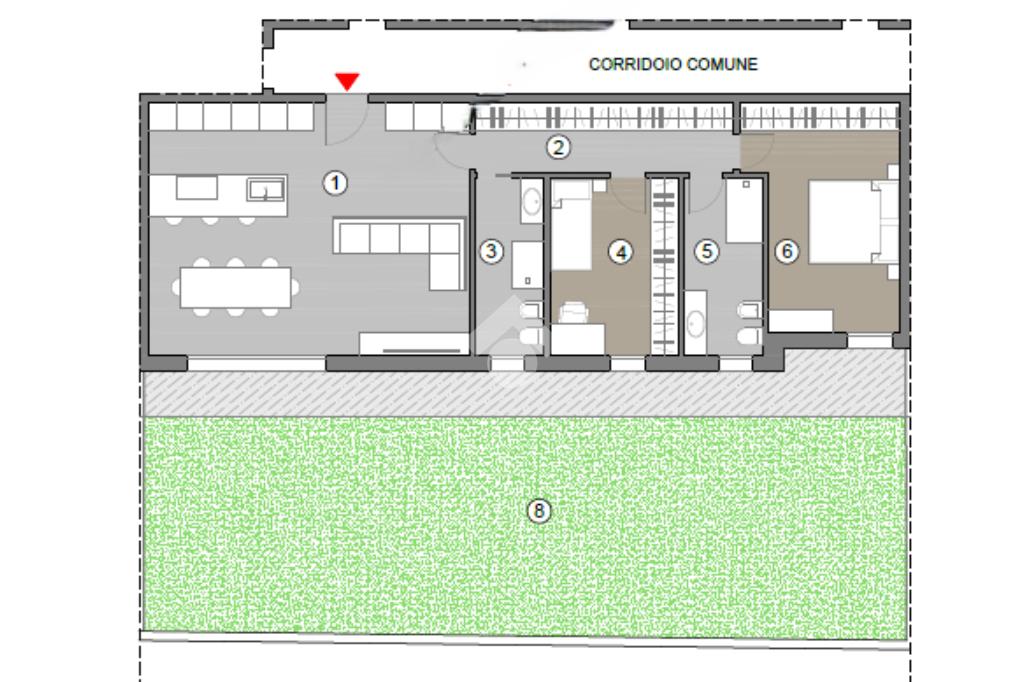 La soluzione proposta è un trilocale al piano terra con giardino privato.