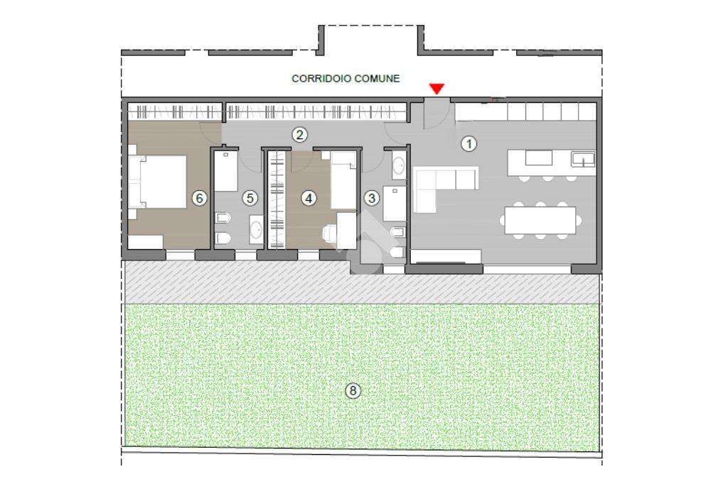 La soluzione proposta è un trilocale al piano terra con giardino privato.