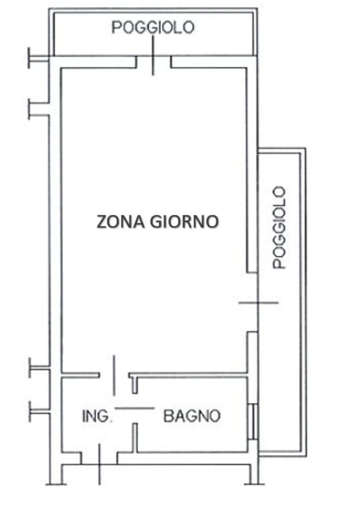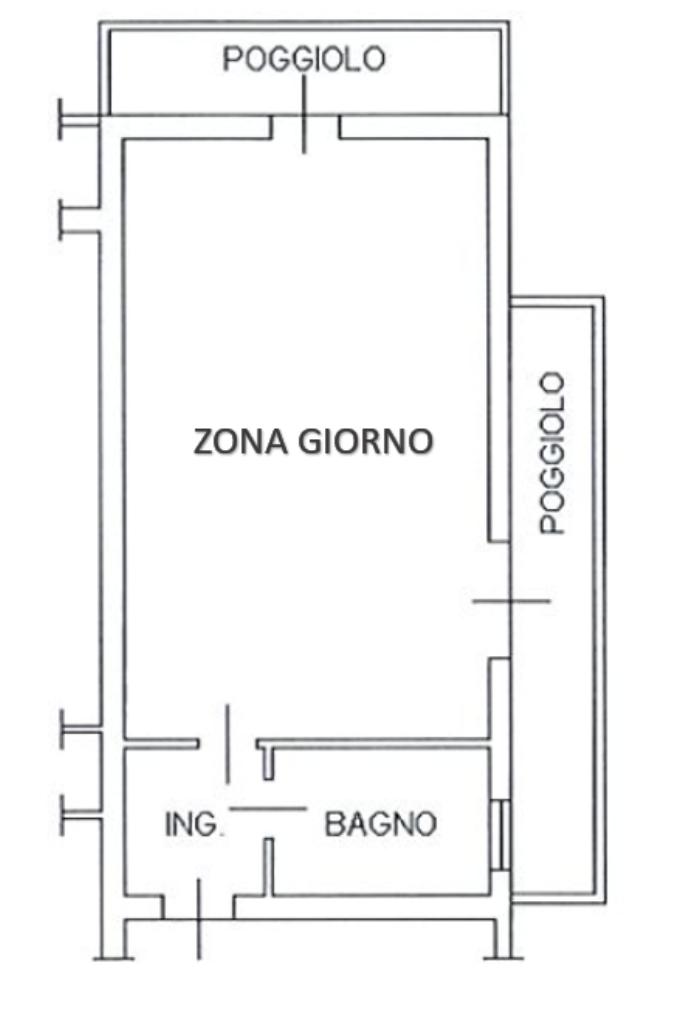 All’ingresso, un comodo disimpegno che attualmente ospita un armadio guardaroba, ci conduce nella zona giorno open space con angolo cottura di oltre 40 mq, dotato di due poggioli che donano luminosità all’ambiente. Al piano è presente anche un bagno finestrato con box doccia.