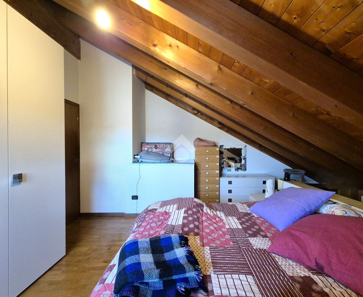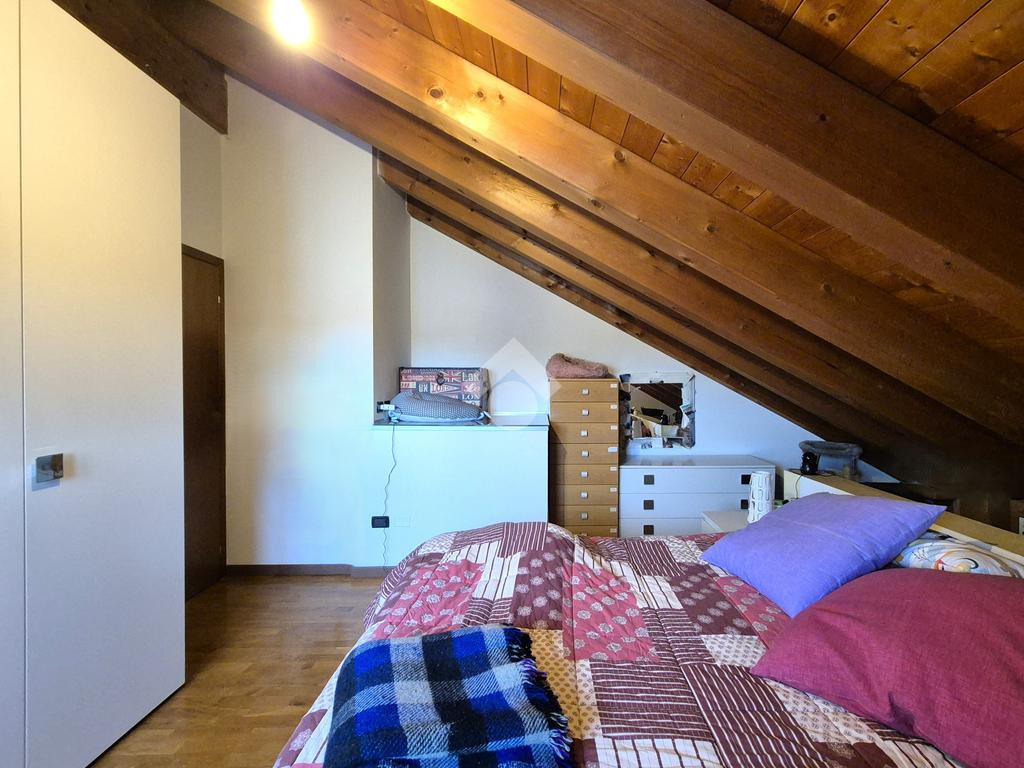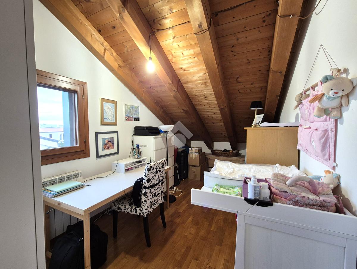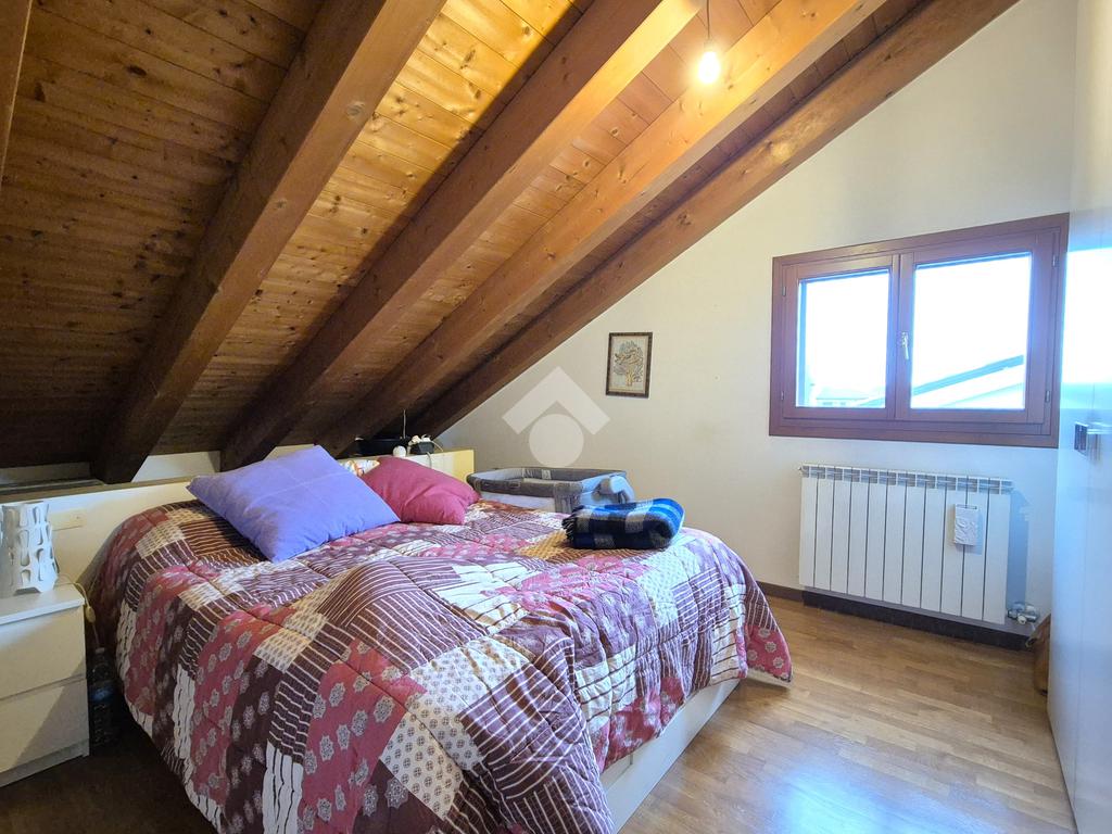 Il reparto notte, caratterizzato dalle travature tipiche del mansardato, ospita due camere da letto, una matrimoniale ed una singola, ed un bagno finestrato con vasca.