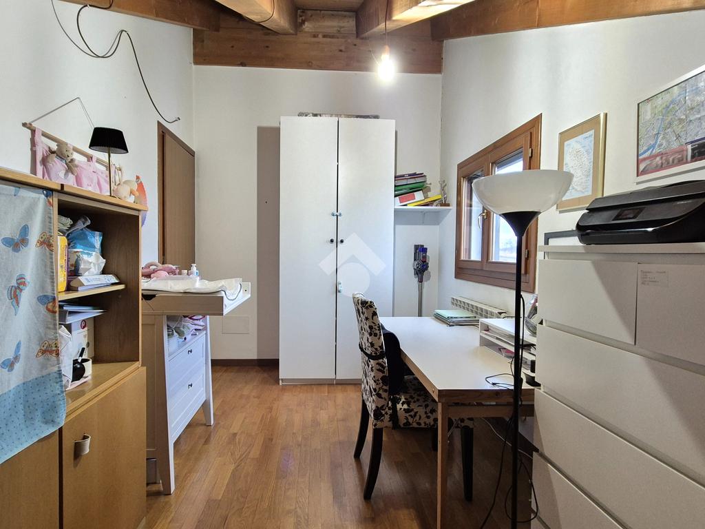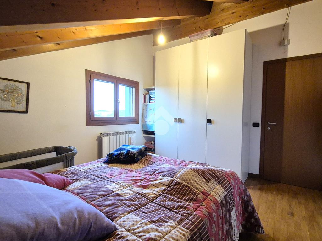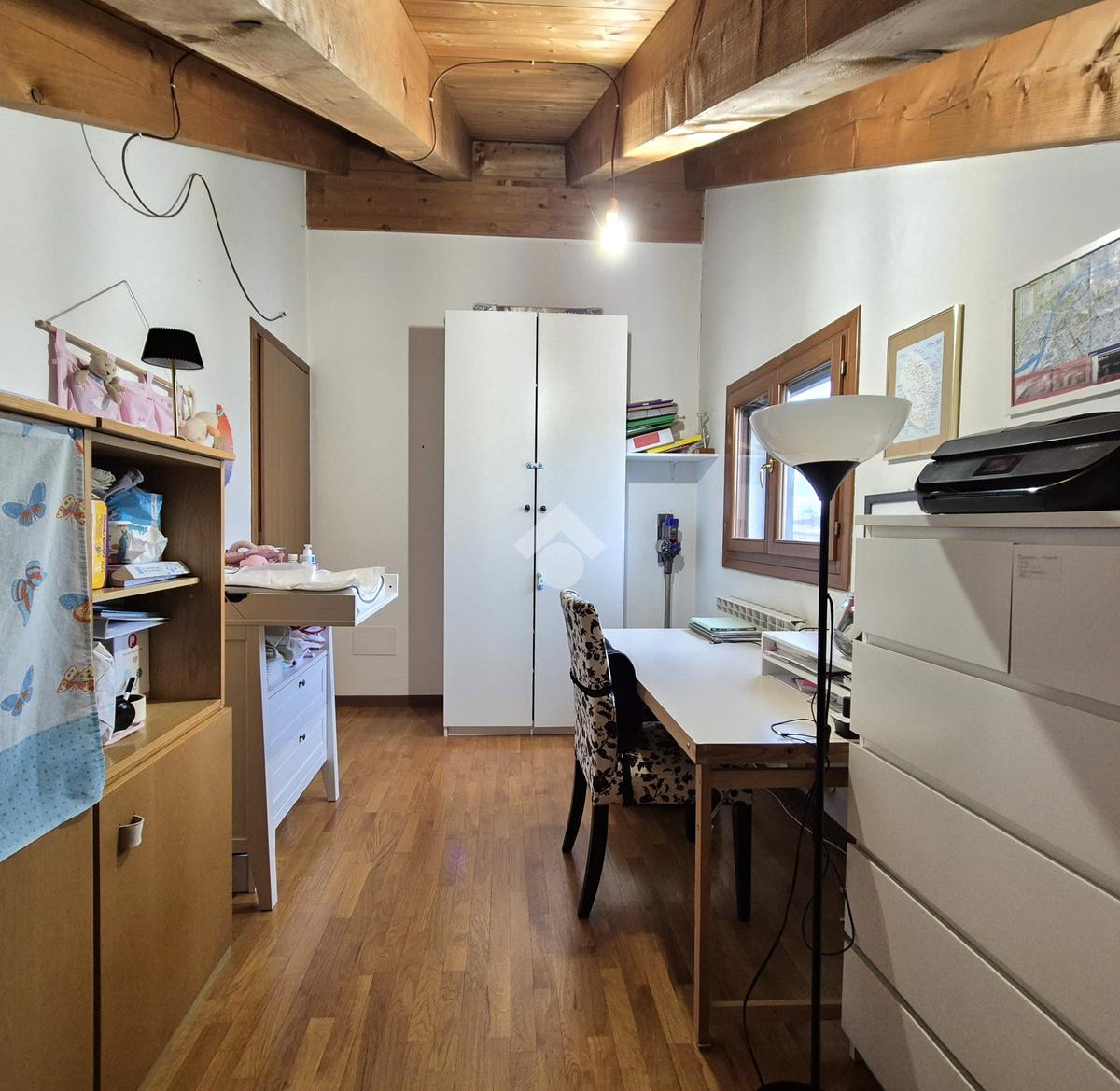 Il reparto notte, caratterizzato dalle travature tipiche del mansardato, ospita due camere da letto, una matrimoniale ed una singola, ed un bagno finestrato con vasca.